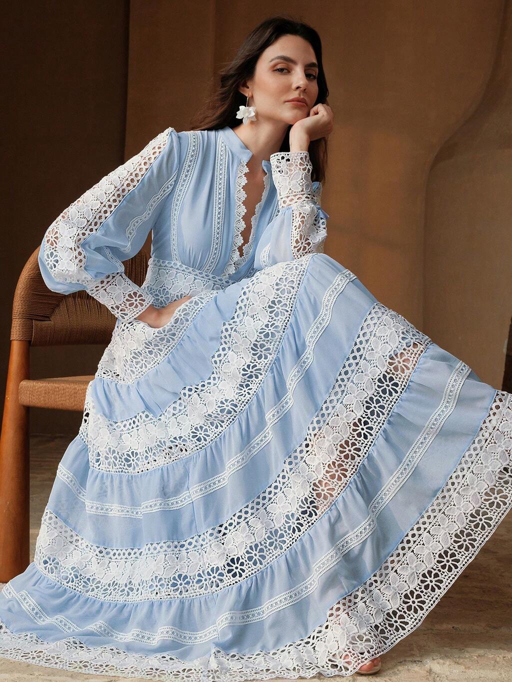 Women's Elegant Lace Patchwork Maxi Dress, French Vintage Style, Suitable For Spring, Festival, Holiday