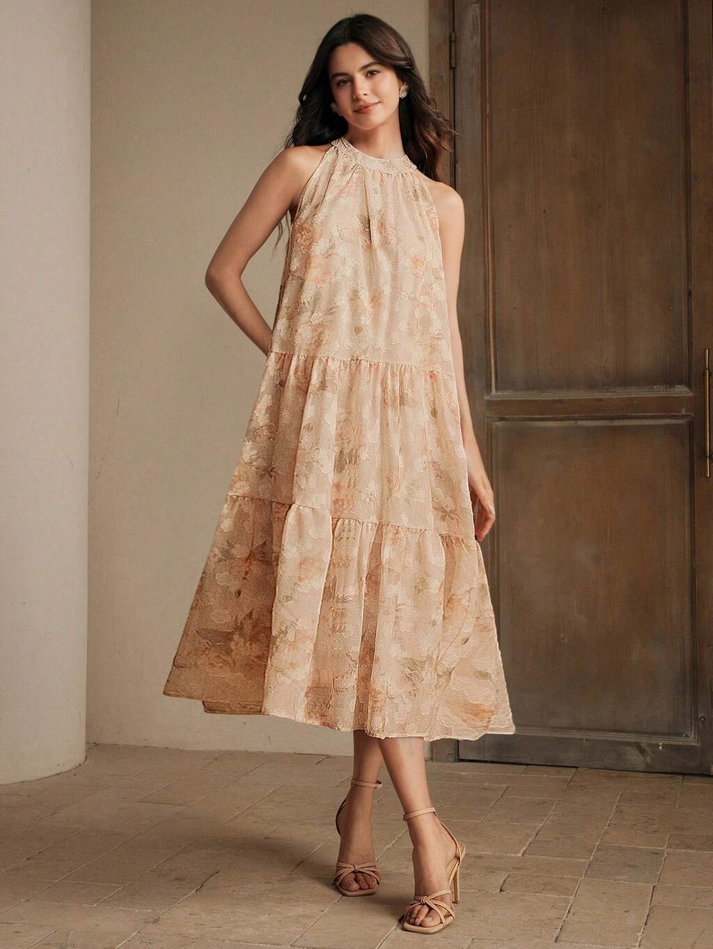 Vestito lungo da donna con design a volant, orlo con balze in tessuto trasparente con stampa floreale, elegante e versatile, perfetto per la primavera