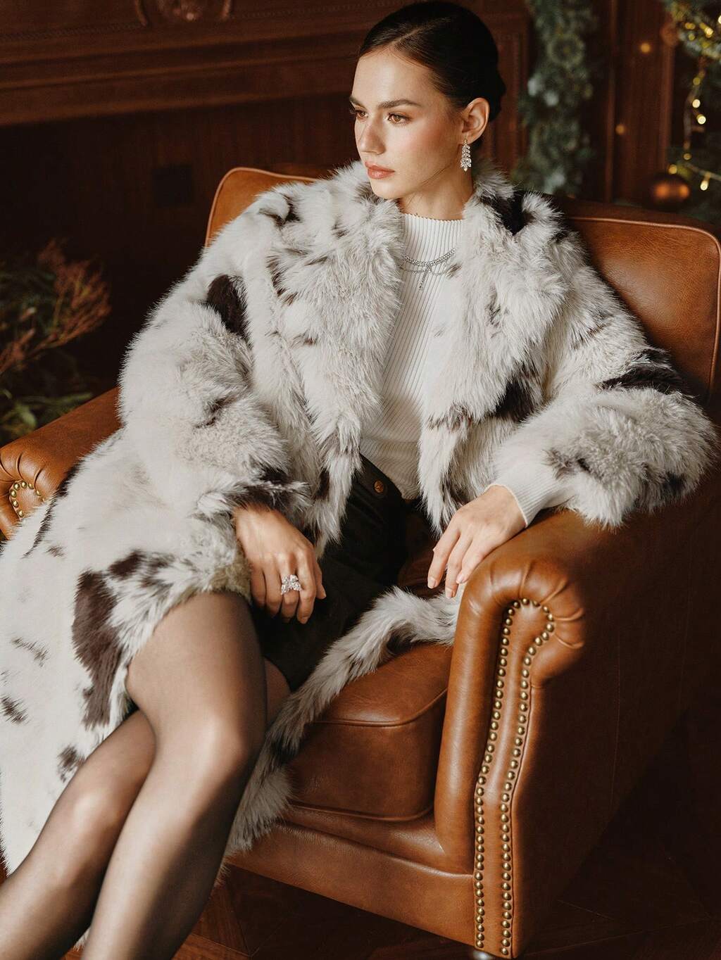 Women's Long Faux Fur Cow Print Coat, Suitable For Autumn, Fall, Winter, Going Out, Elegant, Chic, Formal, Christmas, Casual