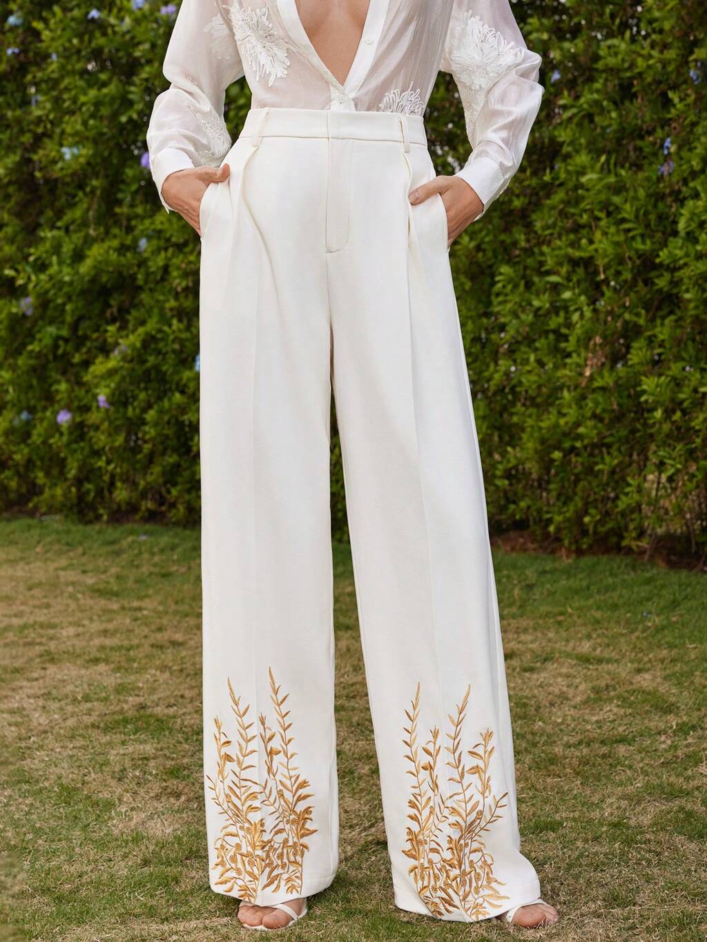 High-Waisted Straight-Leg White Women's Suit Pants With Floral Embroidery, New Year's, Festival, Spring, Vacation