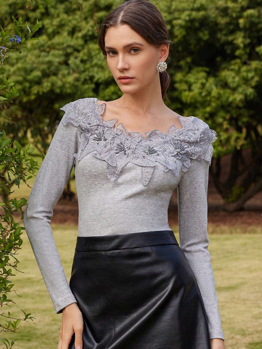 Women's Lace Sheer Elegant Thumb Hole Blouse, Suitable For Holiday Party Attire