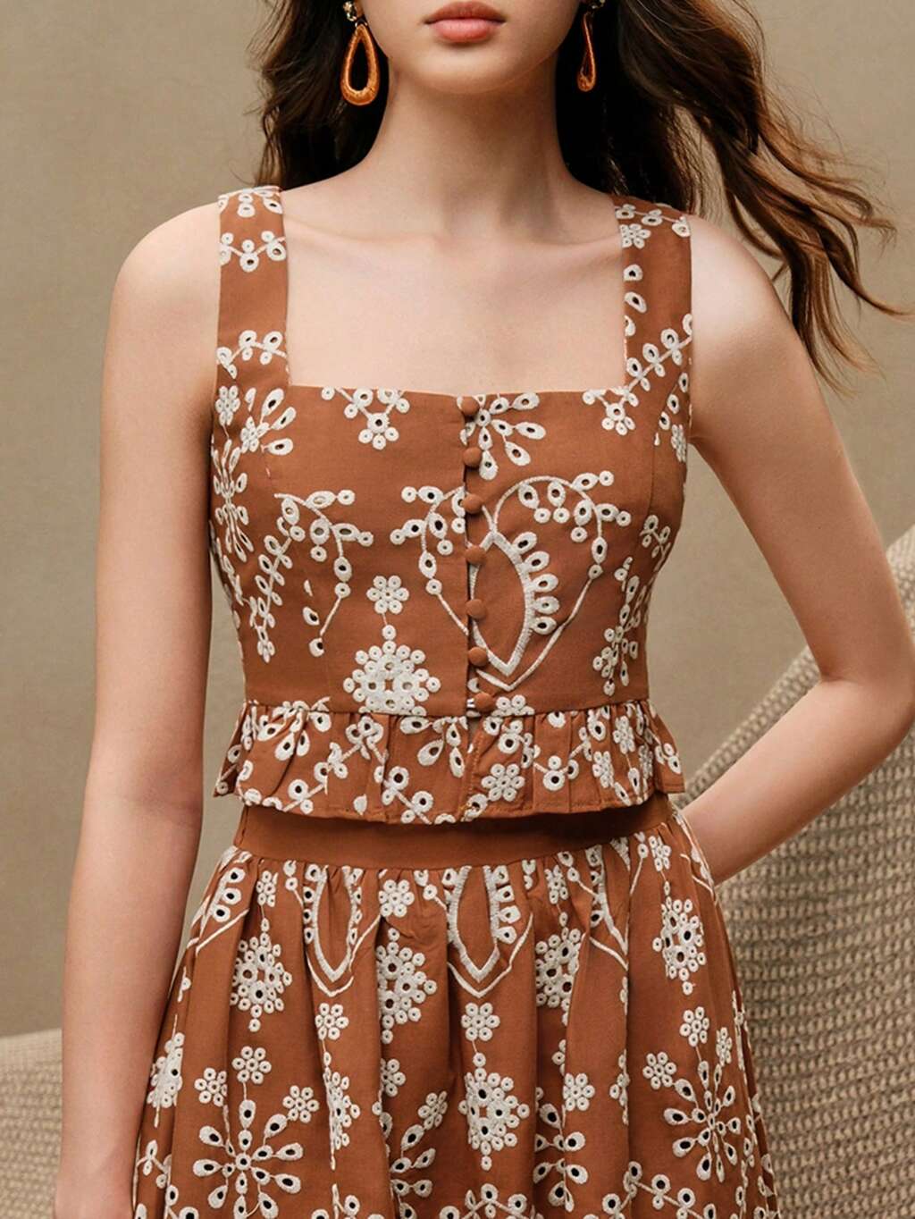French Vacation Elegant Vintage Ditsy Floral Top With Ruffle Hem, Embroidery Skirt Set, Suitable For Spring, Summer, Festival, Graduation