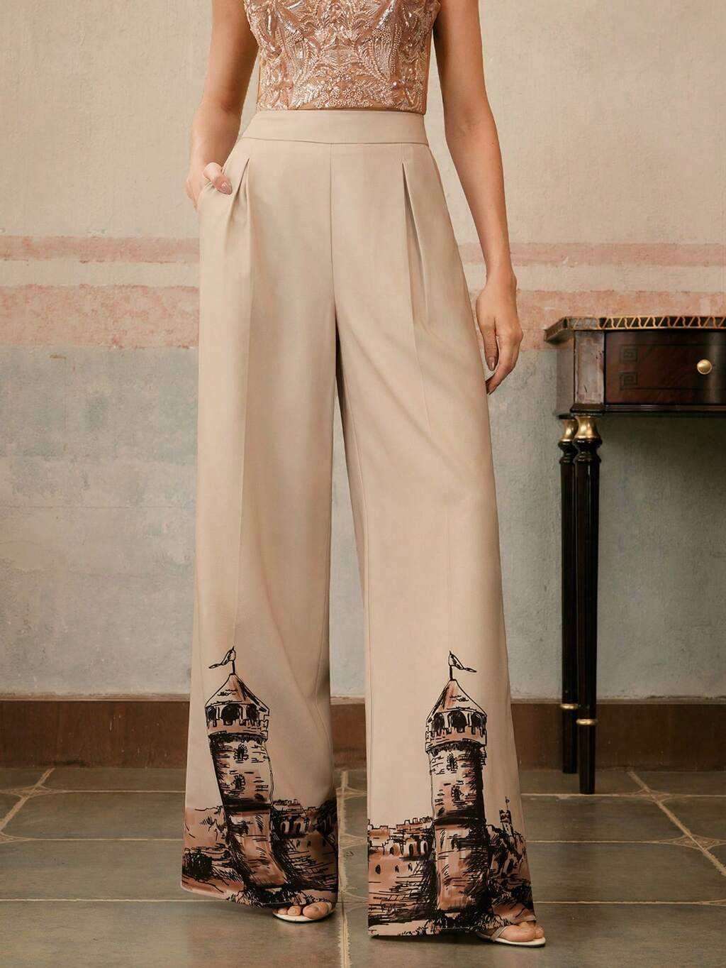 Anewsta Elaire Linen Retro Castle Print Wide Leg Loose Pants, Casual Trousers For Spring Summer Festival Graduation