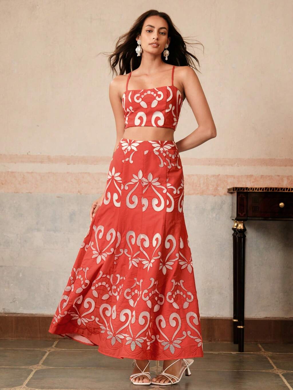 Women 2pcs Set Hollow-Out Embroidered Spaghetti Strap Top + A-Line Skirt, Elegant Personalized, Versatile For Spring, Summer, Vacation, Beach, Casual, Boho
