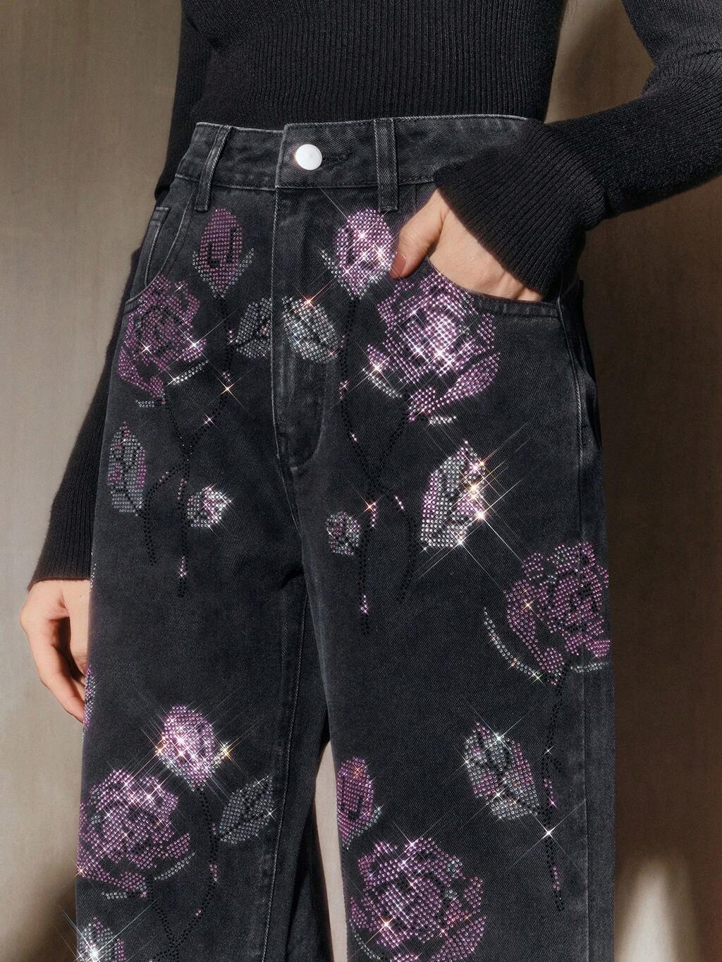 Women's New Valentine's Day Sparkling Rose Embellished Black Straight Leg Jeans