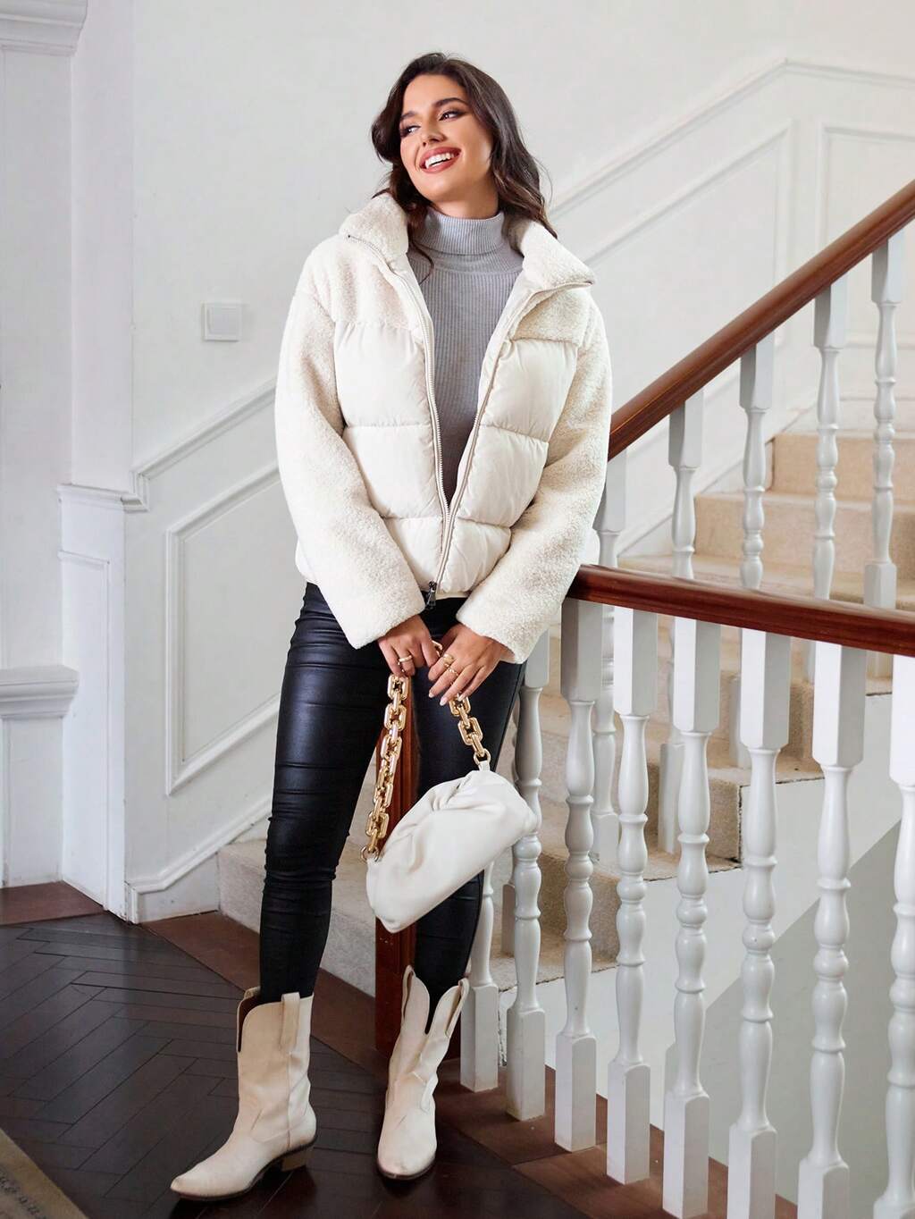 Thick Short Loose Faux Leather Panel Collar Jacket For Women