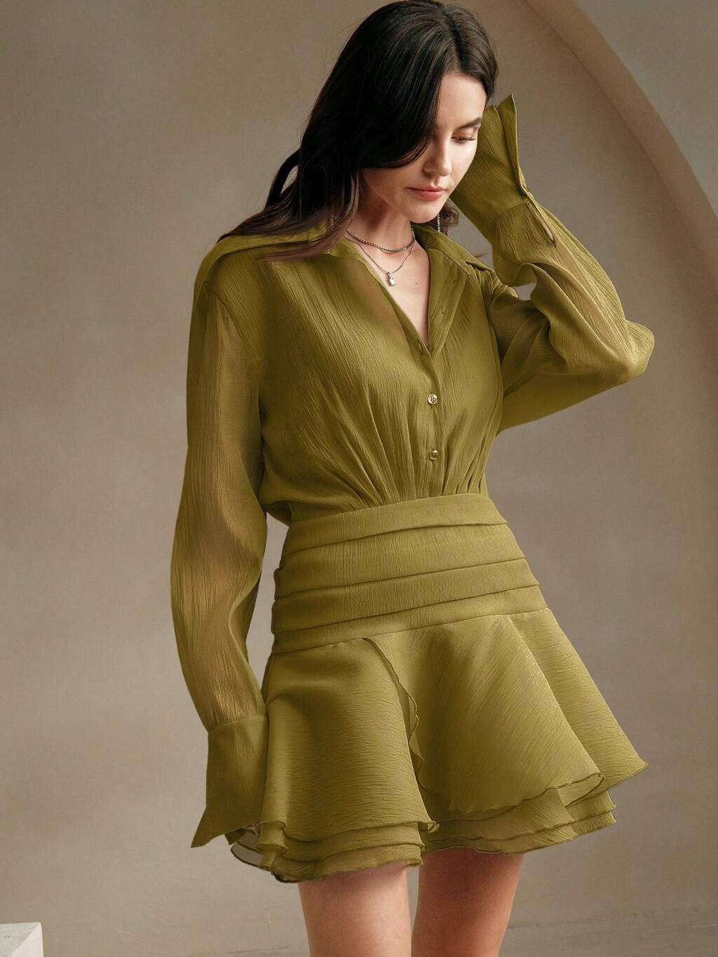 Frühling, elegant, Feiertag, Festival Damen Kleid aus gewebter strukturierter Jacquard-Stoff mit digital eleganten Plissee-Muster, Rundhalsausschnitt, langärmelig, Mini-Länge