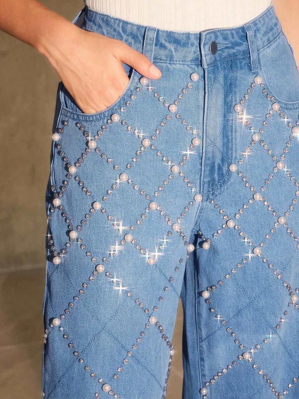 Falda vaquera con diamantes y adornos de cuentas, adecuada para otoño, invierno, Año Nuevo, elegante, chic, con estilo, Navidad, salir