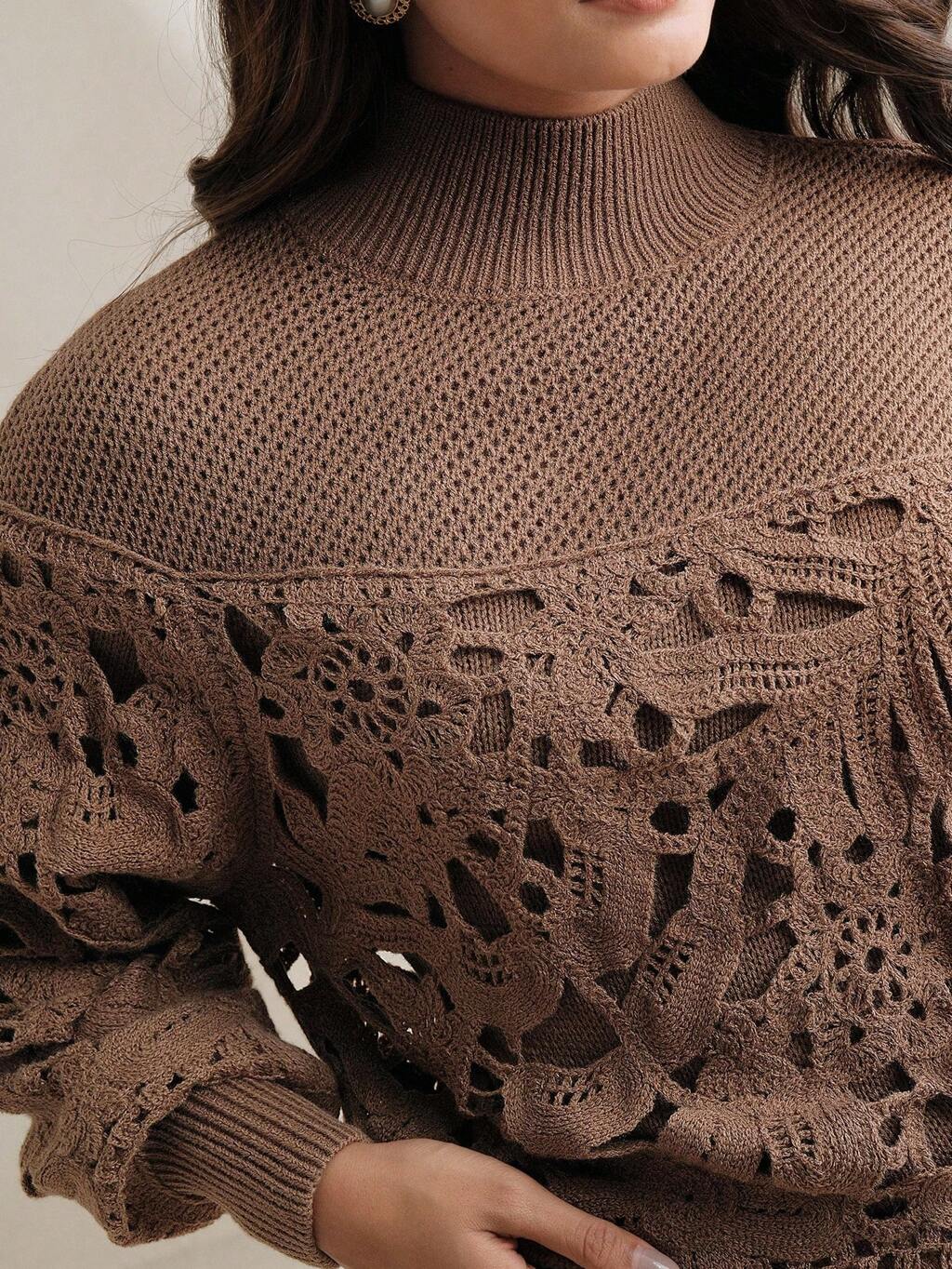 Suéter de punto de invierno para mujer con cuello alto, manga farol y diseño de parches florales huecos de Anewsta. Suéter de mujer con estampado floral para otoño/invierno
