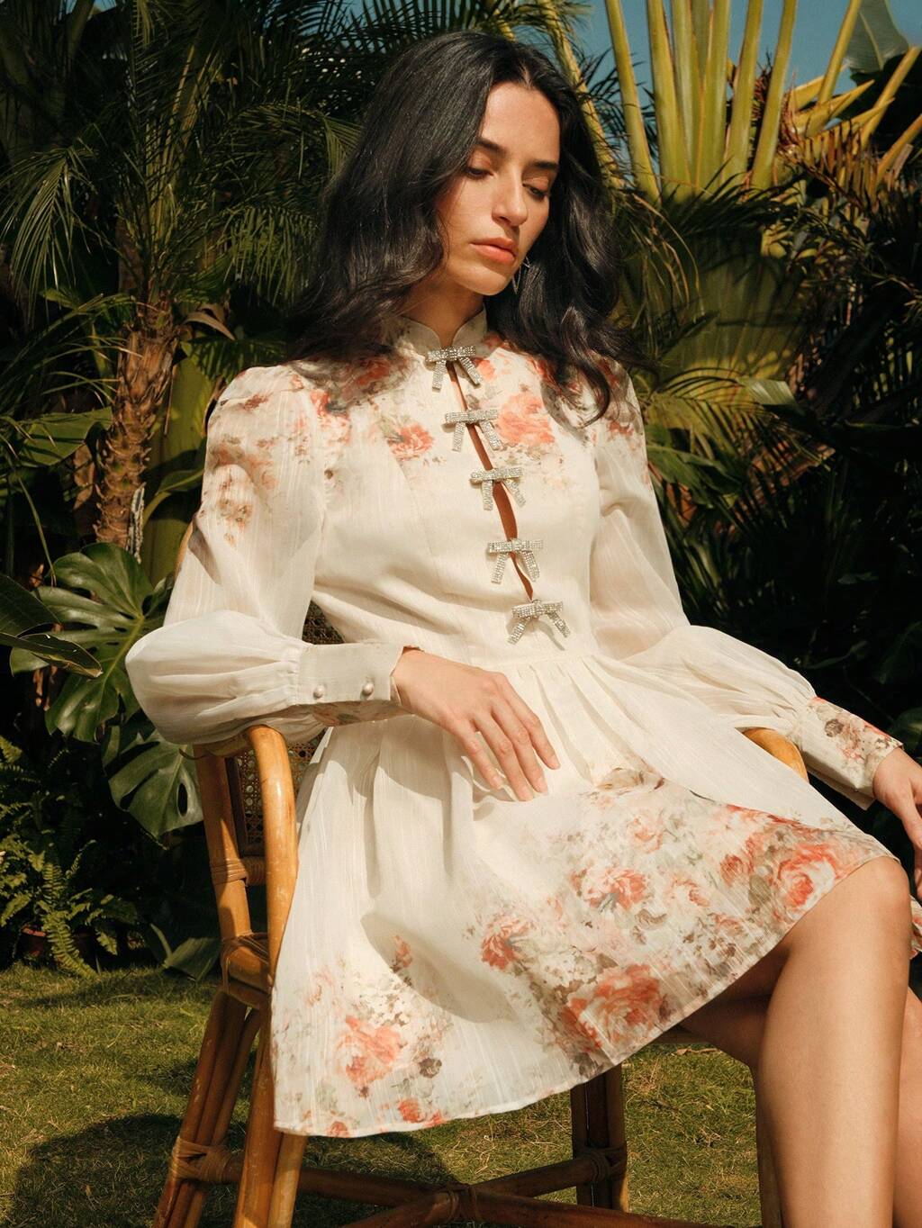 Vestido elegante y romántico con mangas de linterna, estampado floral pequeño y decoración de moño con strass 3D, ideal para citas, fiestas y atuendos primaverales para mujer