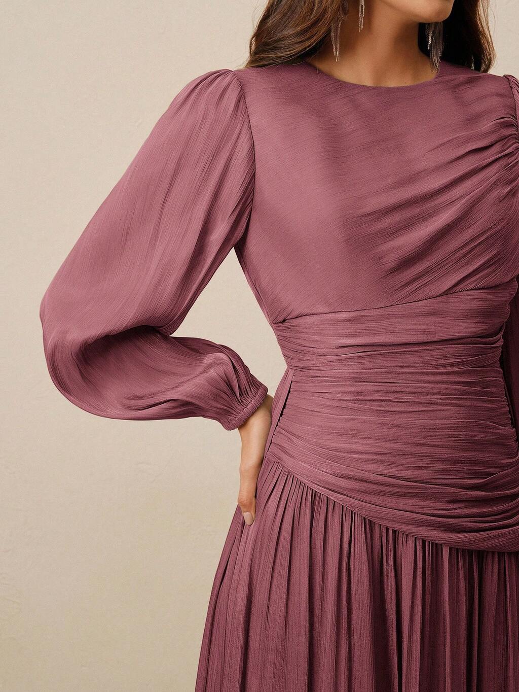 Vestido largo para mujer, cuello redondo, cintura fruncida, manga abullonada, manga larga, verde oliva, brillante, vestido elegante y versátil