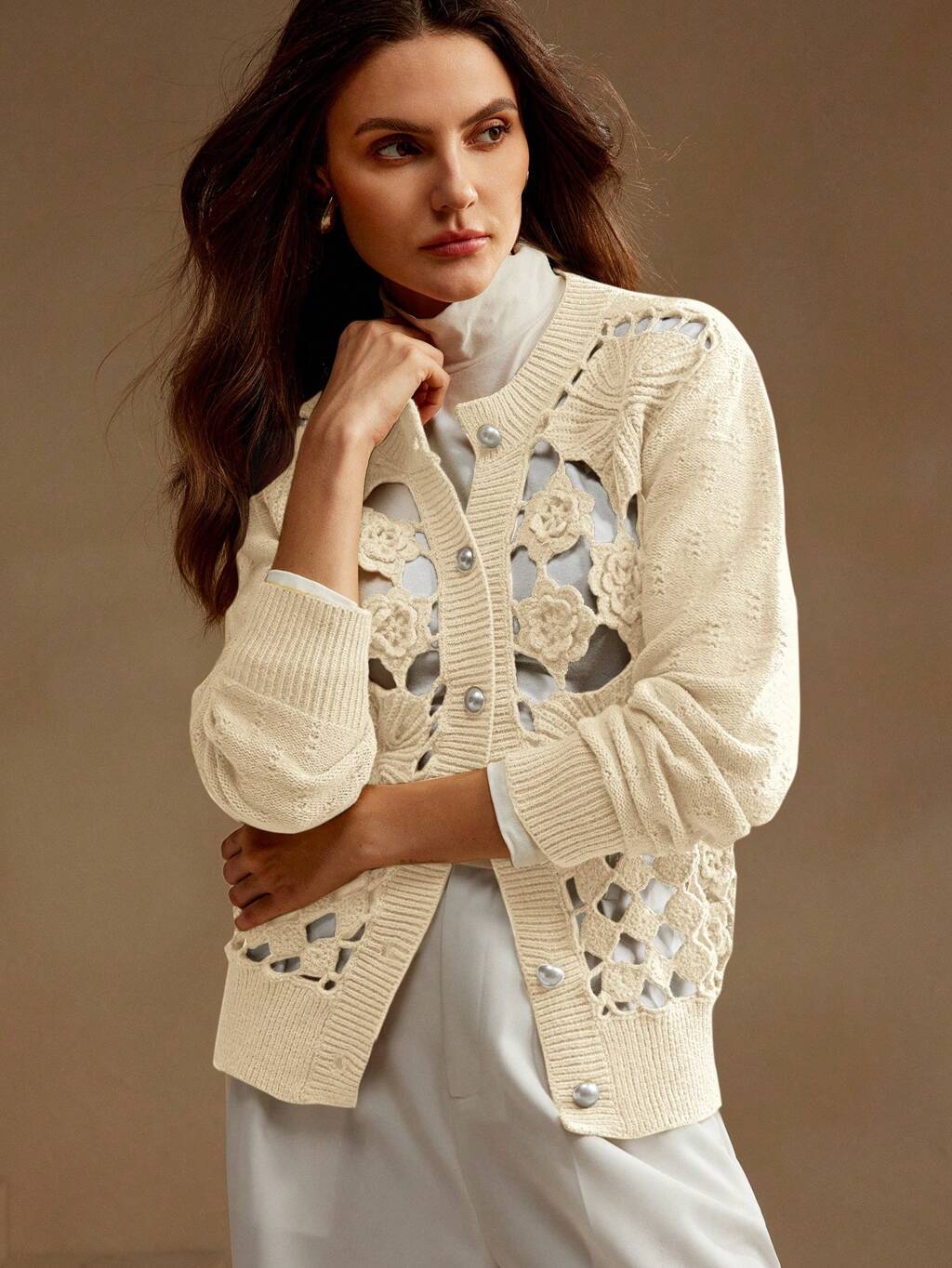 Cárdigan de tejido de flores huecas de doble capa de manga larga, hecho a mano, para mujer, para primavera y otoño