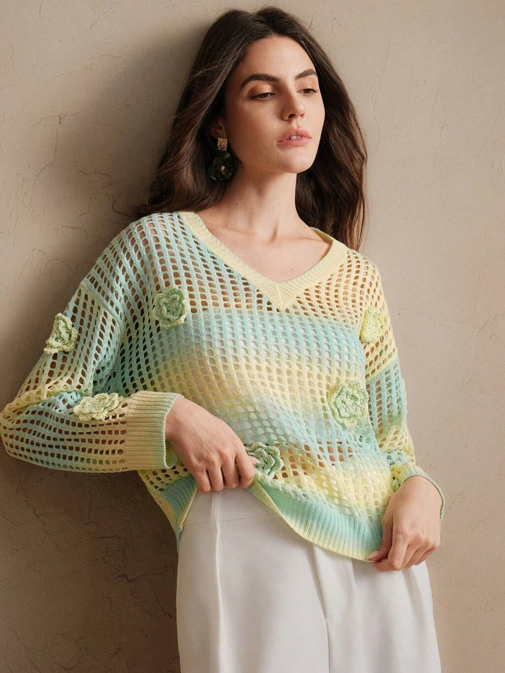 Suéter de playa elegante y casual con flores de ganchillo 3D huecas y degradado, para primavera, verano, vacaciones, otoño e invierno