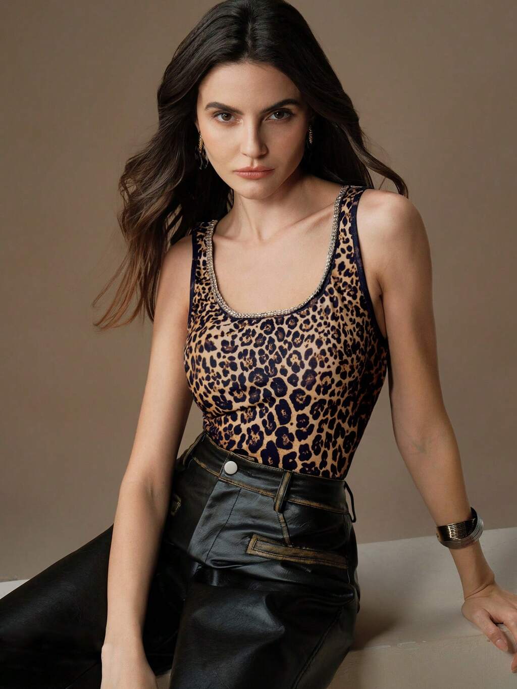 1 pieza Camiseta superior de mujer con estampado de leopardo elegante, adornada con aplicaciones de rhinestone