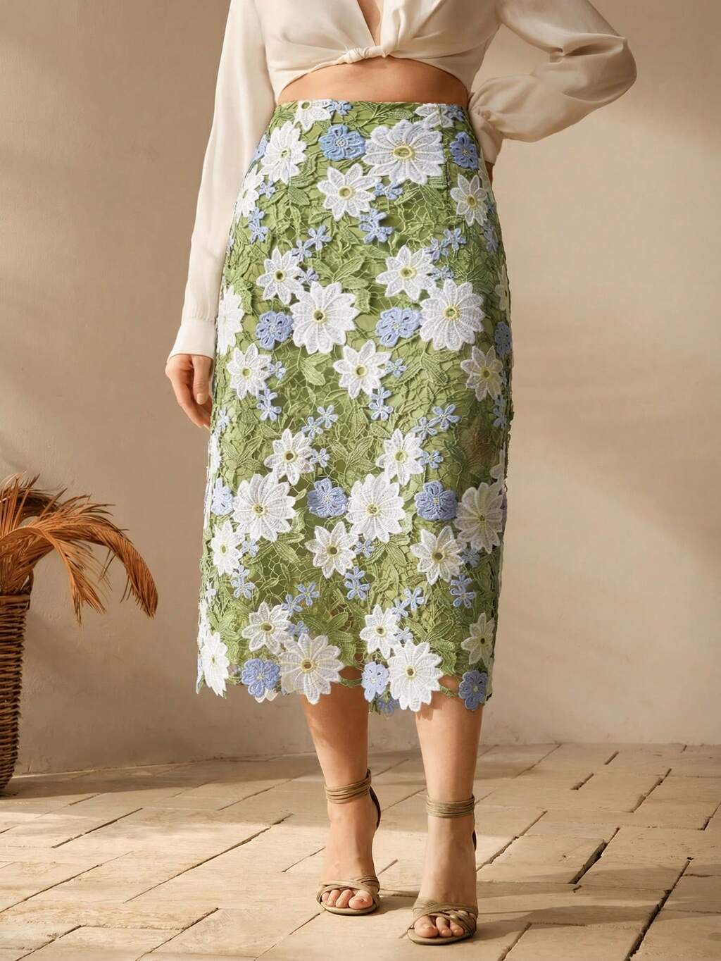 Falda midi elegante y romántica para vacaciones, con diseño de bloque de color y estampado floral, ajuste ceñido, diseño hueco y cómoda talla grande para mujeres
