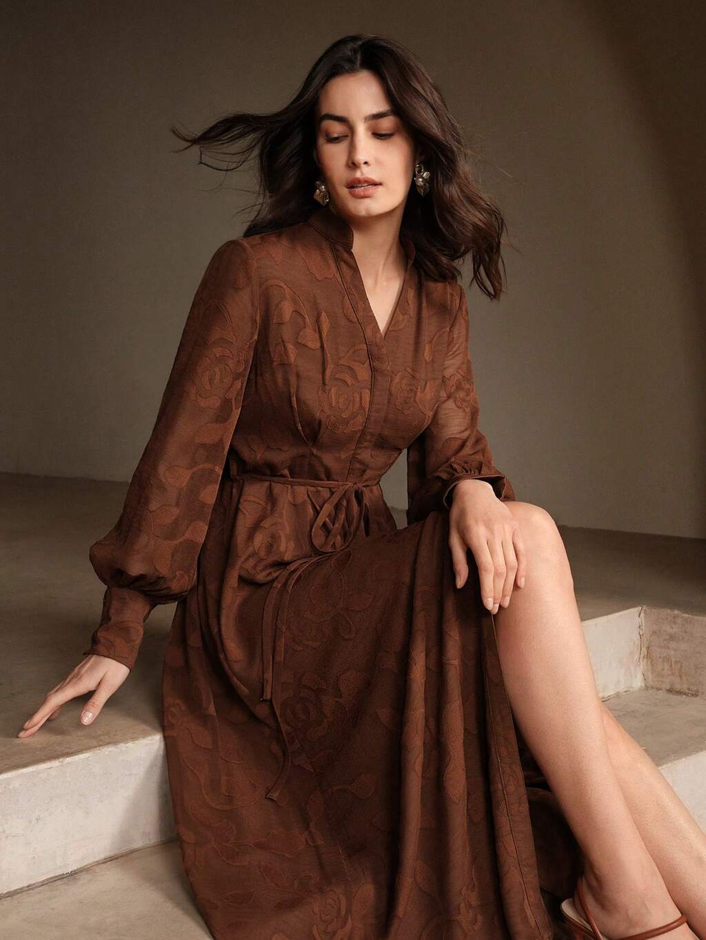Elegante vestido con cuello en V, mangas farol y cintura ceñida con diseño floral, adecuado para Acción de Gracias, Navidad, Año Nuevo Chino y vacaciones para mujeres