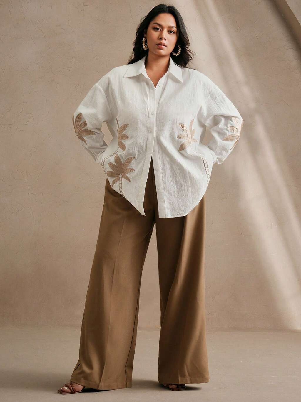 Camisa de manga larga con bordado de flor artesanal en talla grande para mujer, color albaricoque