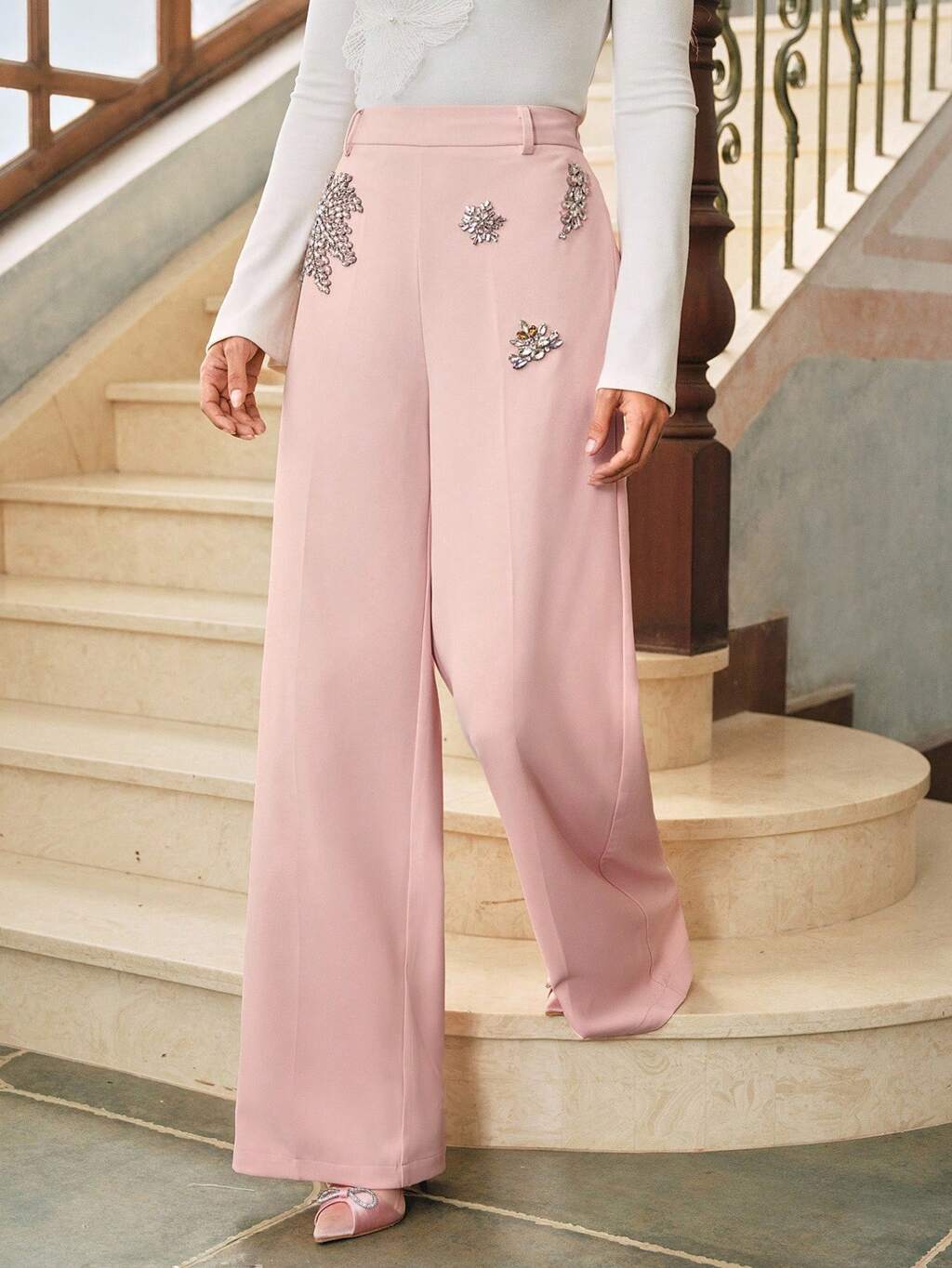 Pantalones rectos de pierna ancha con adornos de strass para mujer