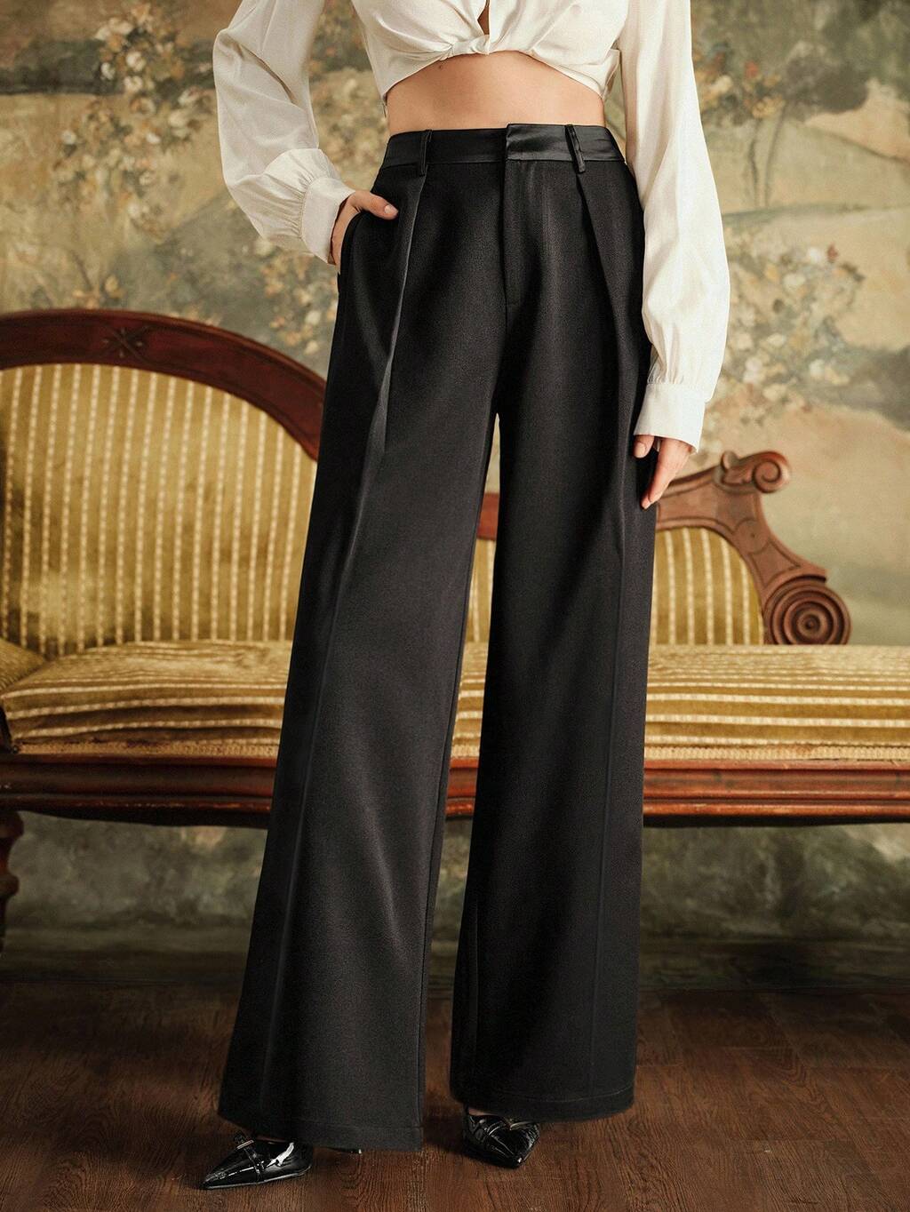 Pantalones rectos de traje con cintura de satén de parche, bolsillo y pierna ancha, versátiles y de moda para uso diario, para otoño/invierno