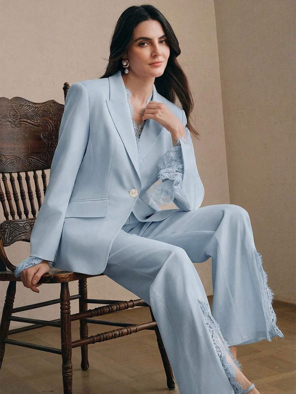 Traje de mujer Anewsta con blazer de encaje elegante y parches, chaqueta y pantalones de corte slim con un solo botón, adecuado para fiesta, elegante, trabajo, graduación, boda, vestido rojo