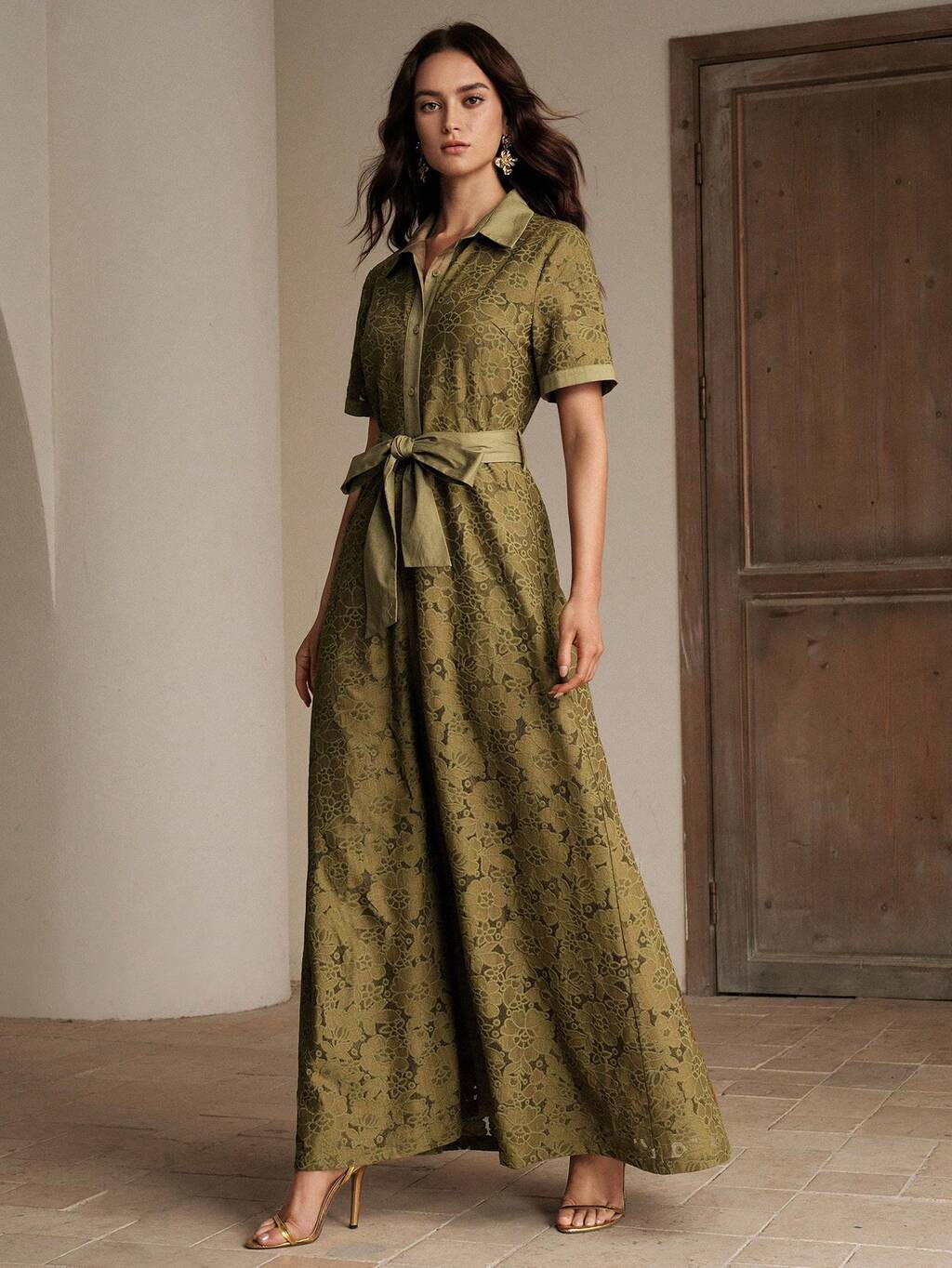 Vestido camisero de manga larga para mujer, con cuello, cierre de botones, cintura ceñida, 100% algodón, tela de encaje, elegante y casual para el trabajo