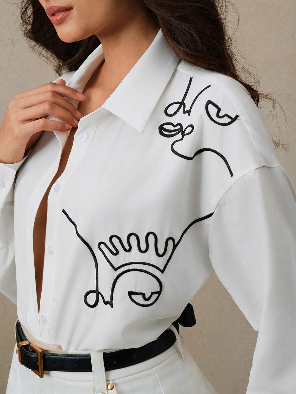 Blusa holgada blanca con cuello vuelto y decoración bordada, elegante y casual, adecuada para primavera/verano, festivales y graduaciones