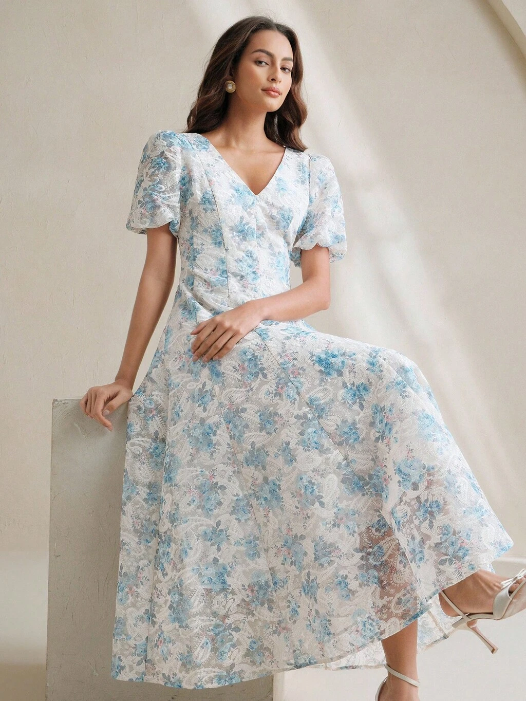 Elegante vestito lungo da donna con maniche a palloncino, stampa ricamata, stile francese, colore blu
