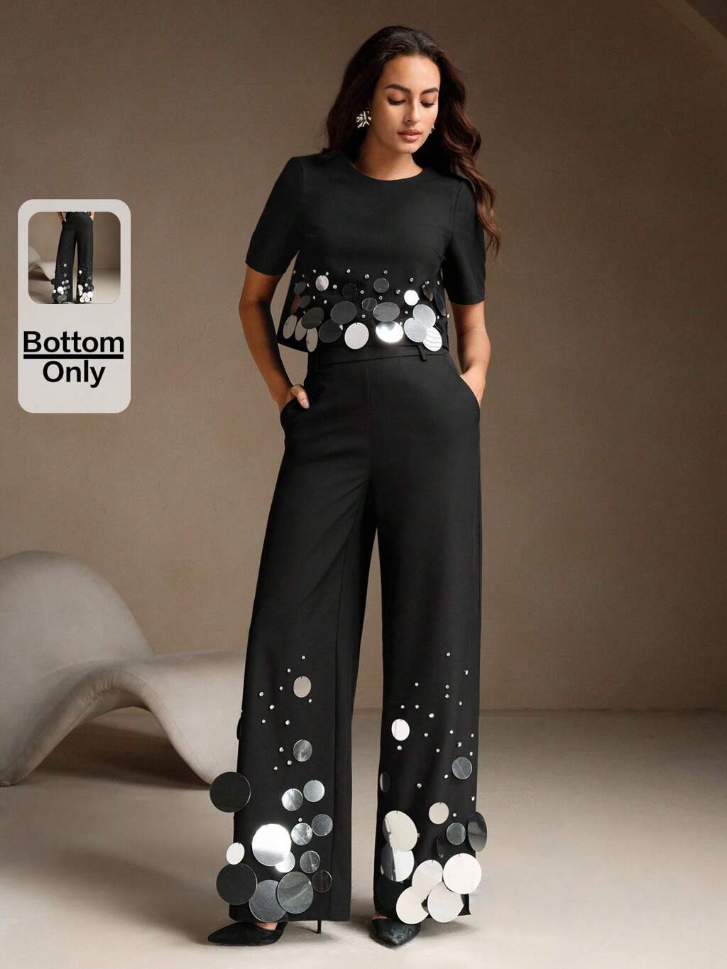 ゆとりストレートハイウエストワイドレッグスパンコール装飾ファッションパンツ