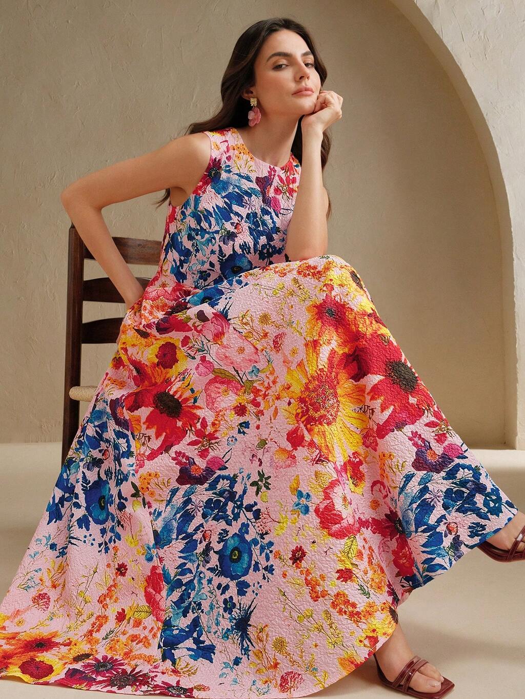 デジタルフローラルヘム付き モダンエレガントドレス、ミディ丈、夏、フェスティバル、エレガント、休暇、パーティー、結婚式ゲスト、ビジネスカジュアル向け