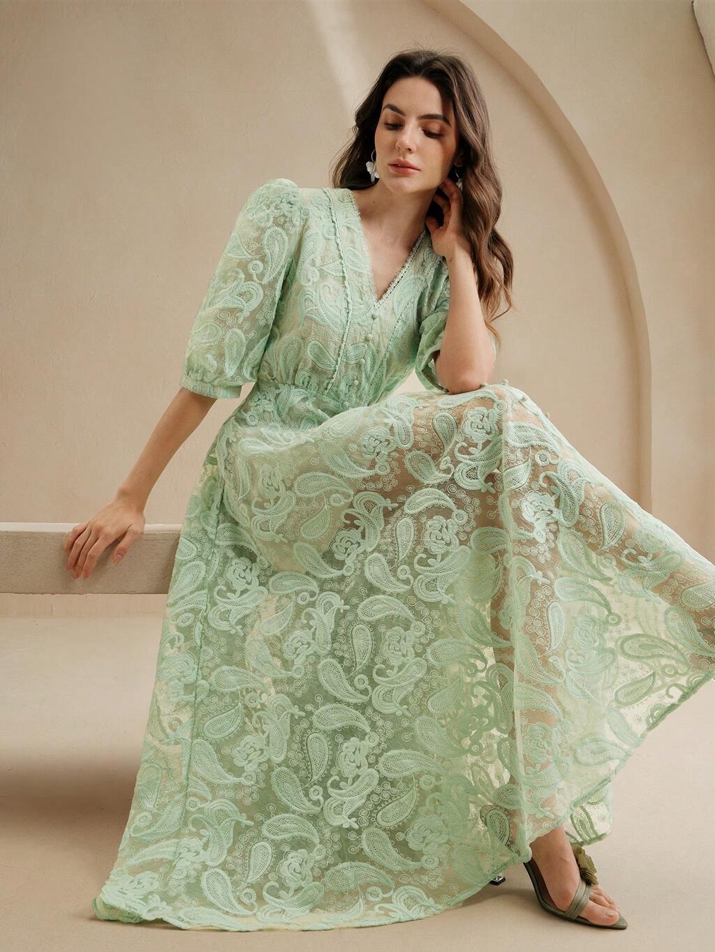 春、夏、エレガント、バケーション、デートナイト、ビーチ向け レディース Vネック セミシアー ウエストシャーリング メッシュ素材 刺繍入り マキシワンピース
