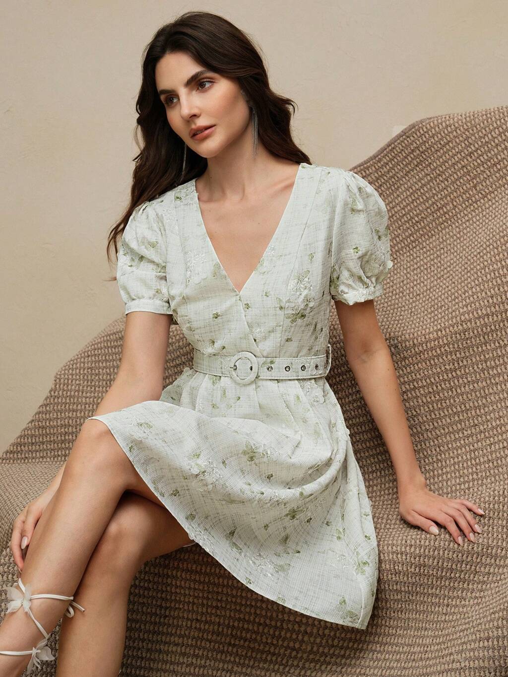 上品なフレンチスタイル ディジーフラワー パフスリーブ Vネック ベルト付きウエストドレス、春夏のフェスティバルや卒業式に