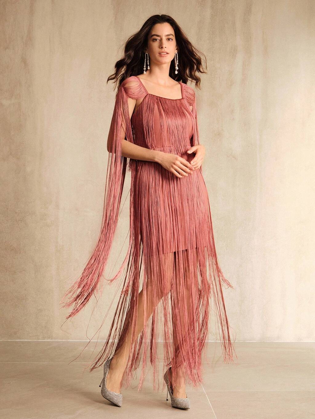 女性用エレガントな結婚式ゲストパーティードレス ローズピンク バンデージ スクエアネック 長袖 タッセル パッチワーク ショート丈、秋冬、新年会、パーティー、結婚式、エレガント、シック、スタイリッシュ、イブニングドレス