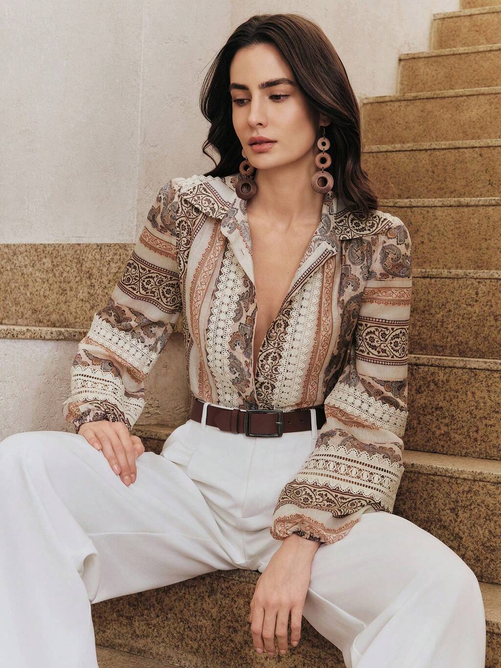 レトロ フローラル プリント パッチワーク襟 ランタンスリーブ ブラウス、春夏シーズンに適しています