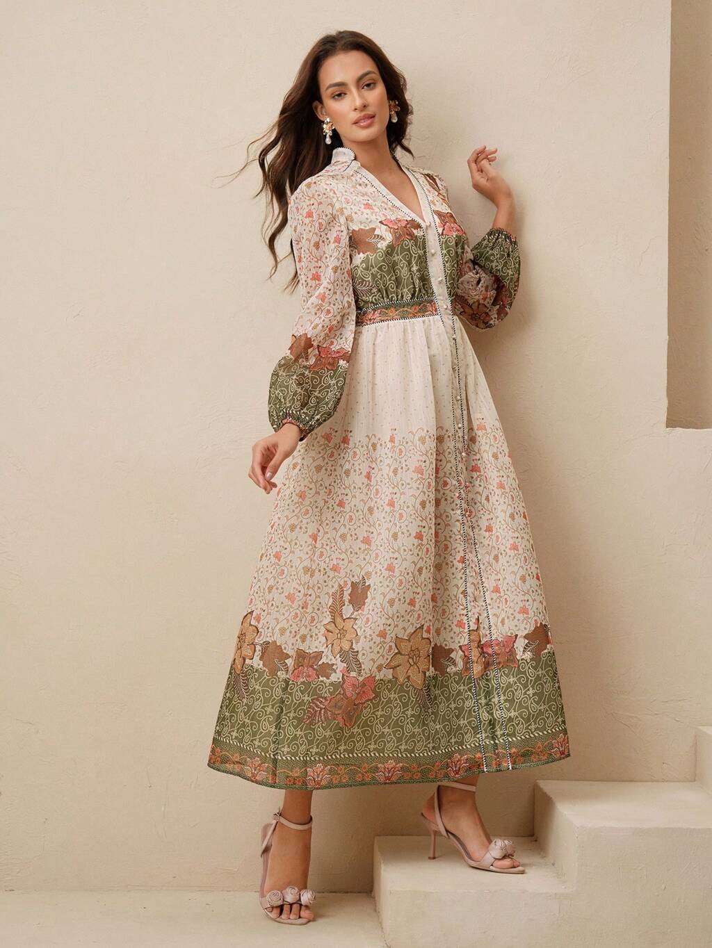 女性用 新作 カシューフラワープリント 長袖 エレガントマキシ Aラインドレス、休暇に最適な高級で洗練されたデザイン