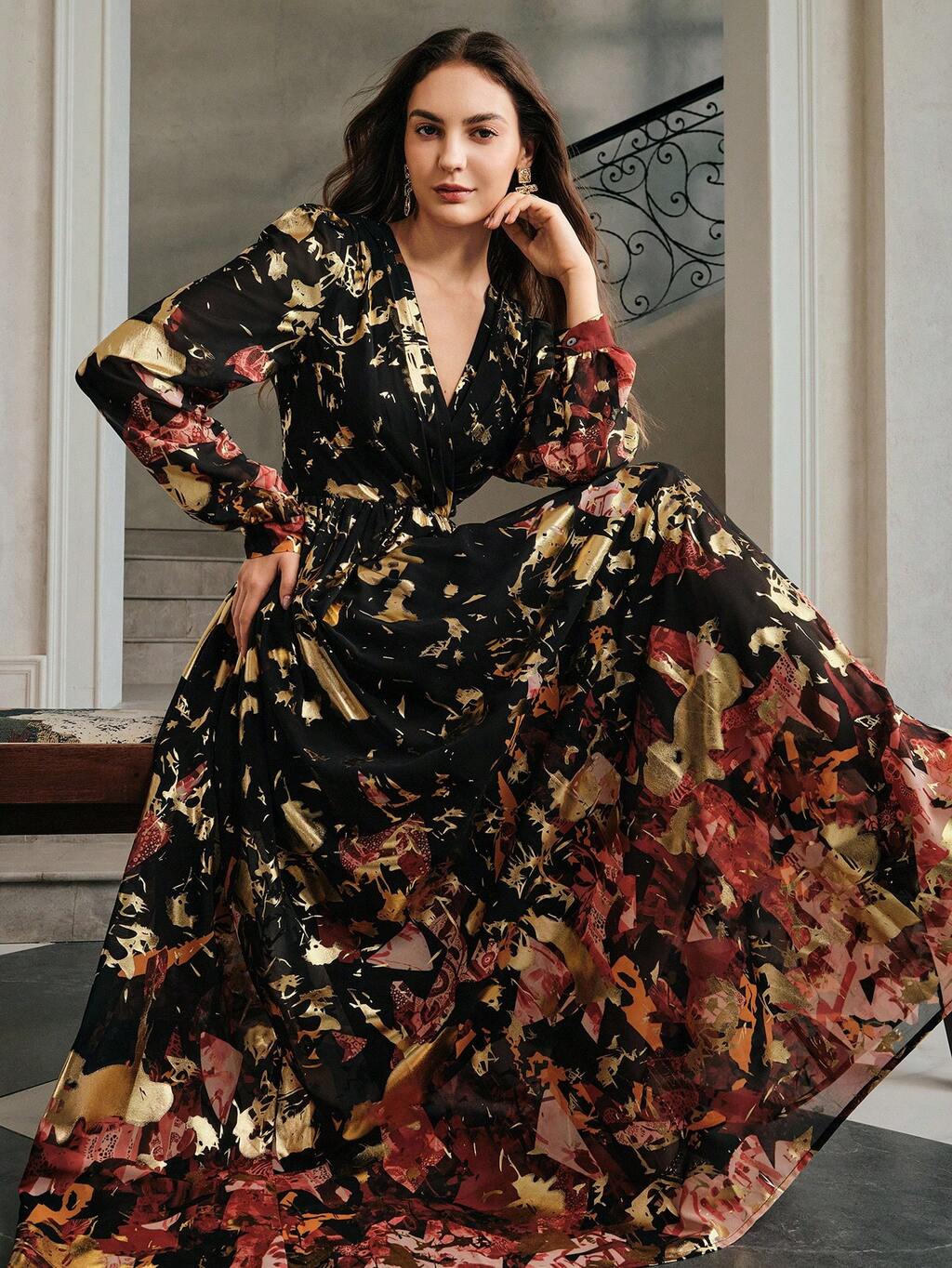 エレガントな花柄箔プリントロングスリーブレディースドレス、秋冬、新年会、パーティー、結婚式、エレガント、シック、スタイリッシュ、イブニングドレスに適しています