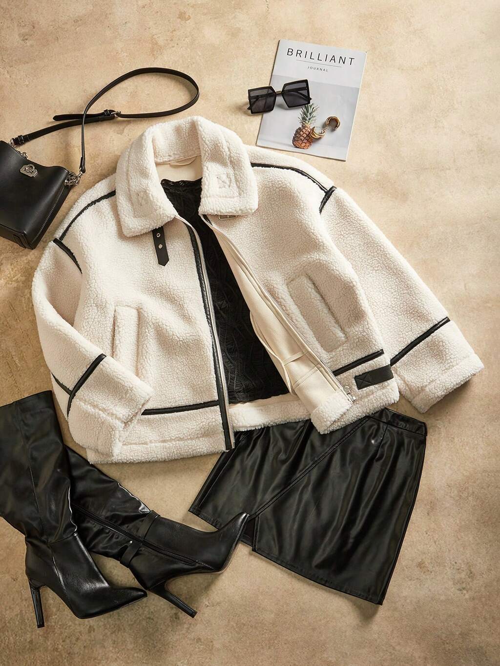 フリース 厚手 & フェイクレザー パッチワーク ルーズフィット ショートジャケット