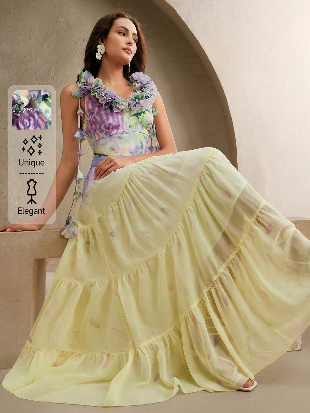 上品なシフォンフレアワンピース、フィット感のあるテクスチャー高級感のあるミディアムドレス