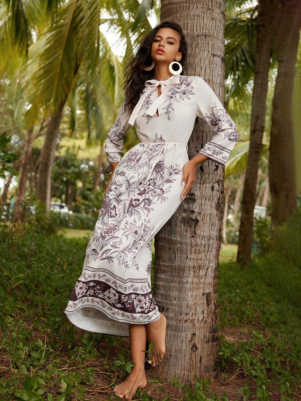 Anewsta バケーションスタイル フローラル プリントワンピース ノットフロントとウエストシンチデザイン マキシワンピース レディースアウトフィット
