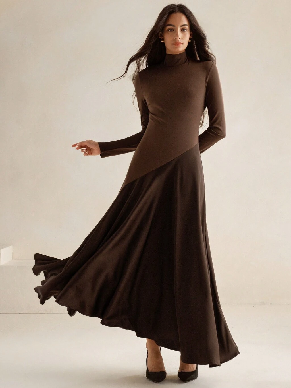 小柄な女性のエレガントなアーバンハイエンドニット&ウーブンパッチワークスタンドカラー長袖フレアードレス、コーヒーカラー