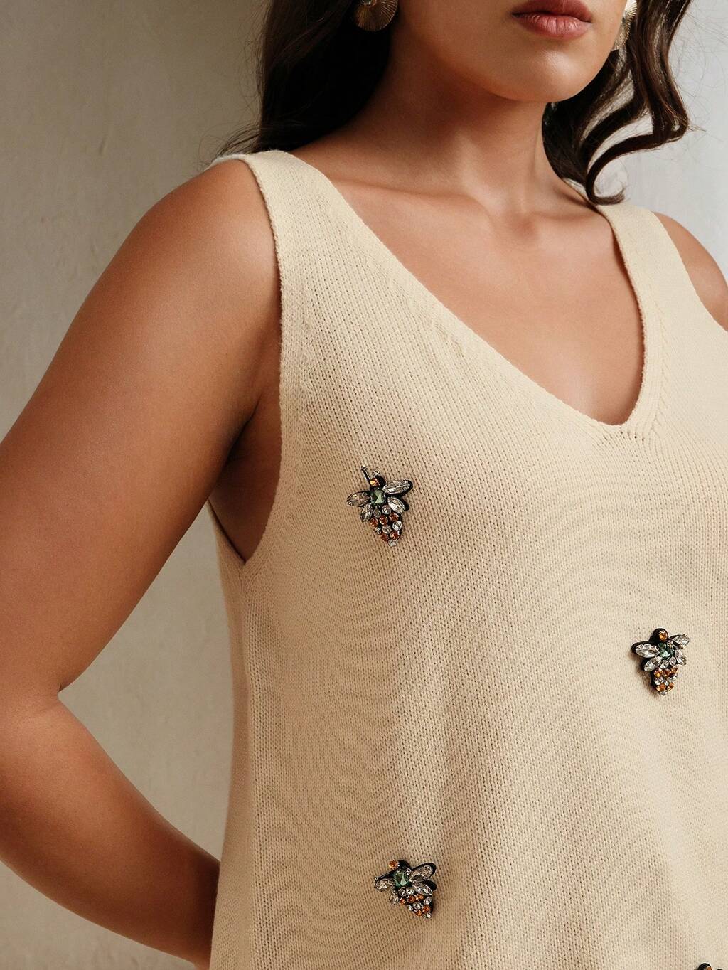 プラスサイズ 1枚 女性用 エレガントでモダンなラインストーンビー装飾Vネックニットトップ