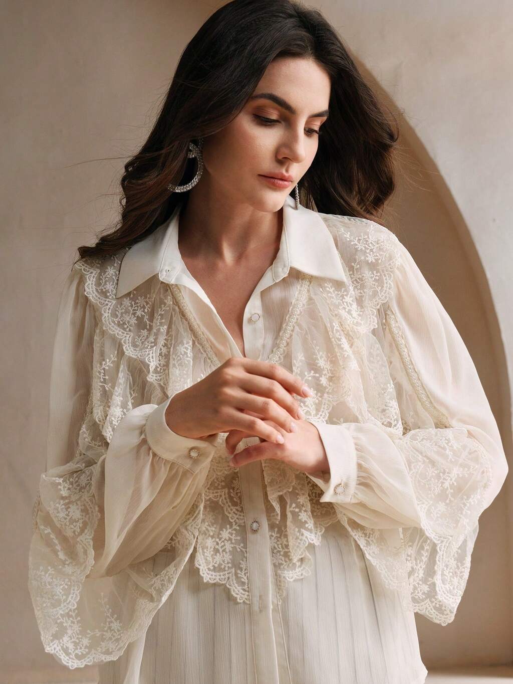 クリスマス フレンチレース フリル パール装飾ランタン袖シフォンブラウス、ベージュ/アイボリー レディースシャツ