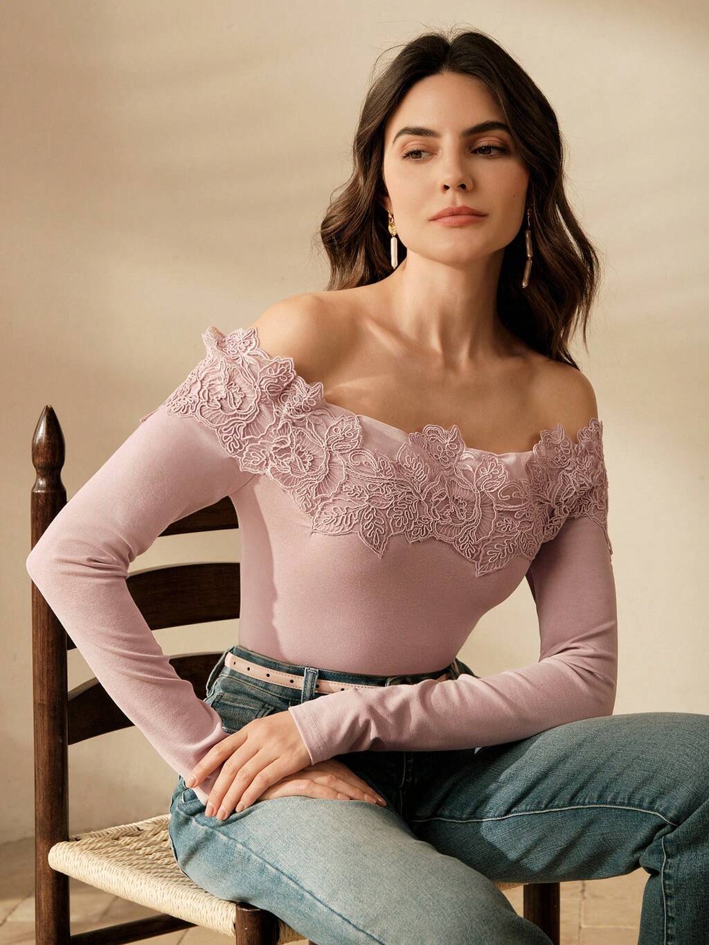 女性用テンセル ニット エレガントデート オフショルダー レースパッチワーク 長袖Tシャツ、春夏