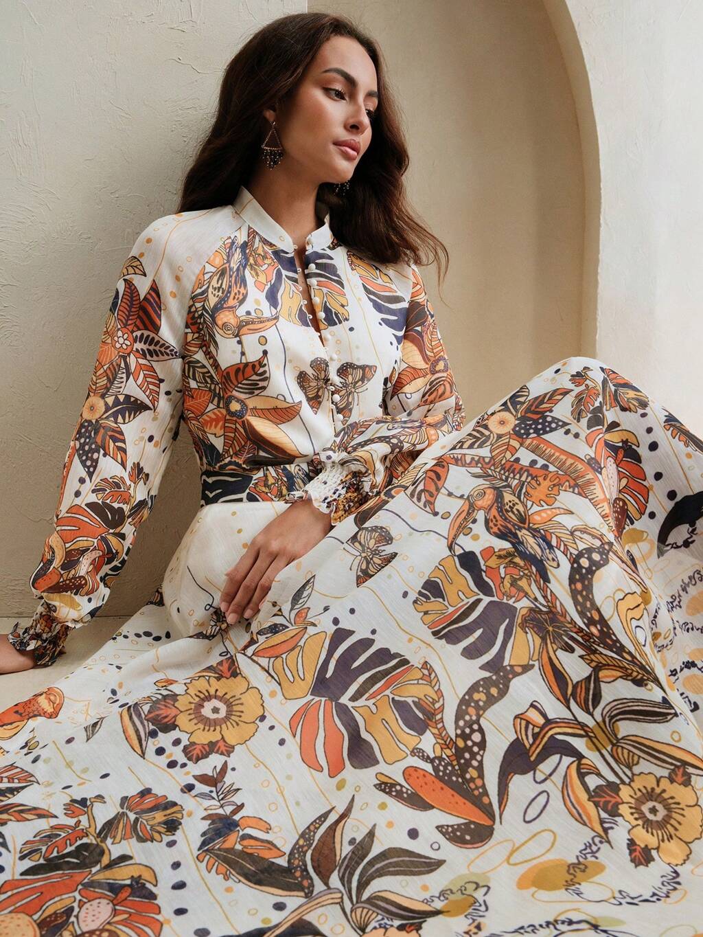 優雅なプリント ランタンスリーブ オープンフロント ロングドレス レディース、夏