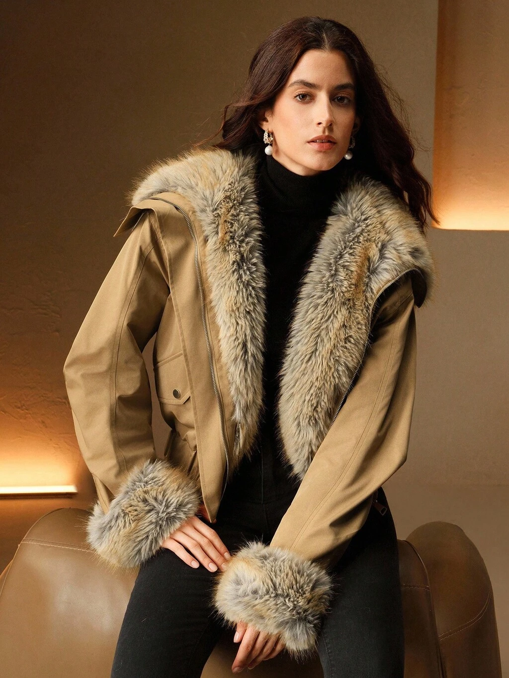 フェイクファートリム付き レディースジャケットコート