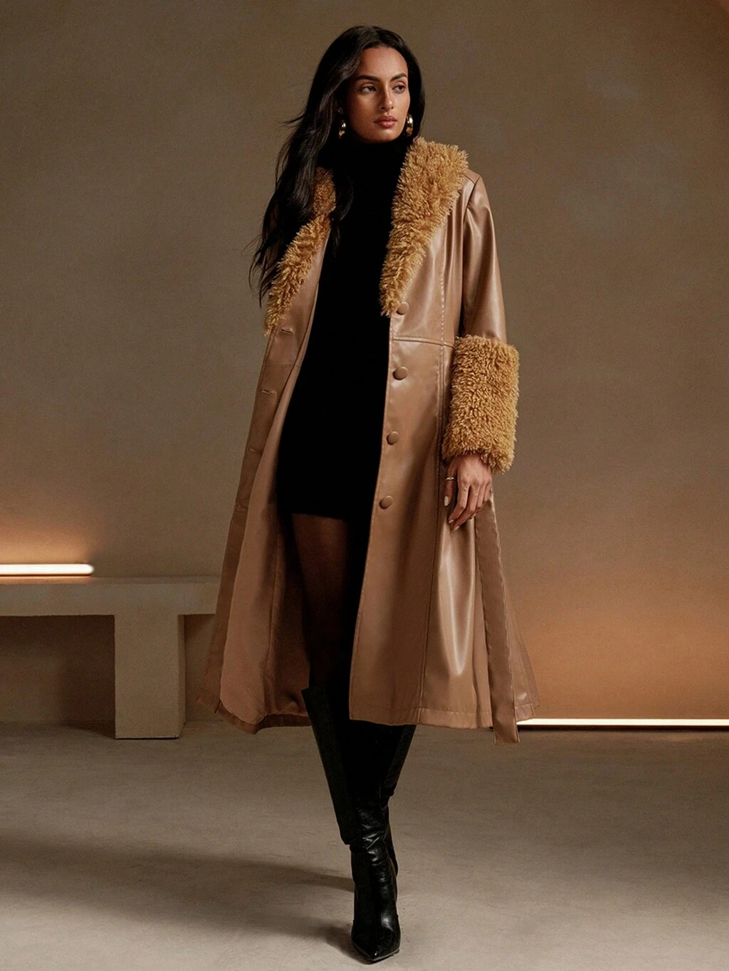 長袖ウエストリボン付きボタン付きエレガントなニット風ファー襟付き偽pu革スリーブ長袖コート