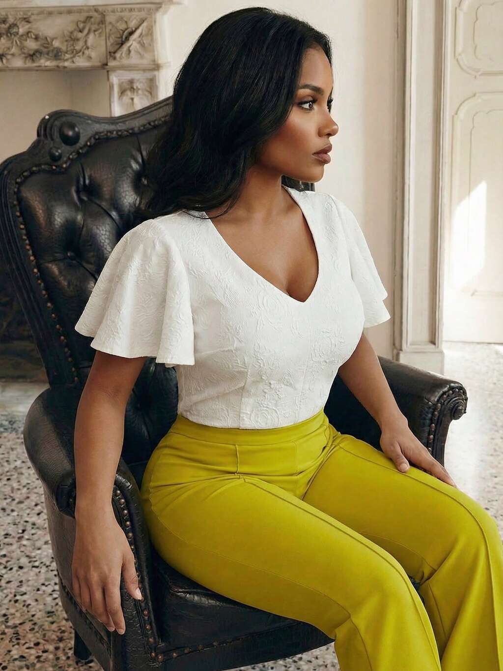 女性用ミニマリストコミュータージャカードフリルスリーブVネックタイトトップ、夏用