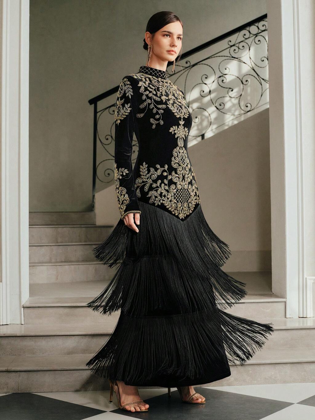 女性用エレガントなクリスマス&ハロウィンヴィンテージラグジュアリーブラック ベルベット ゴールド刺繍 ラインストーン装飾 スタンドカラー 長袖 レイヤード タッセル裾 フィットミドル丈ドレス、秋冬、新年会、パーティー、結婚式、エレガント、シック、ブラック、スタイリッシュ、イブニングドレスに適しています
