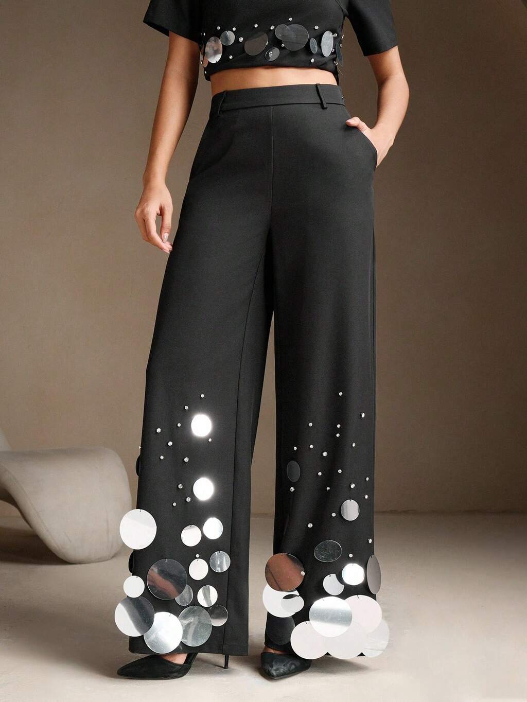 スパンコールとビーズのウエストベルト装飾付き ショートレッグスーツパンツ レディース、新作秋冬パーティーウェア