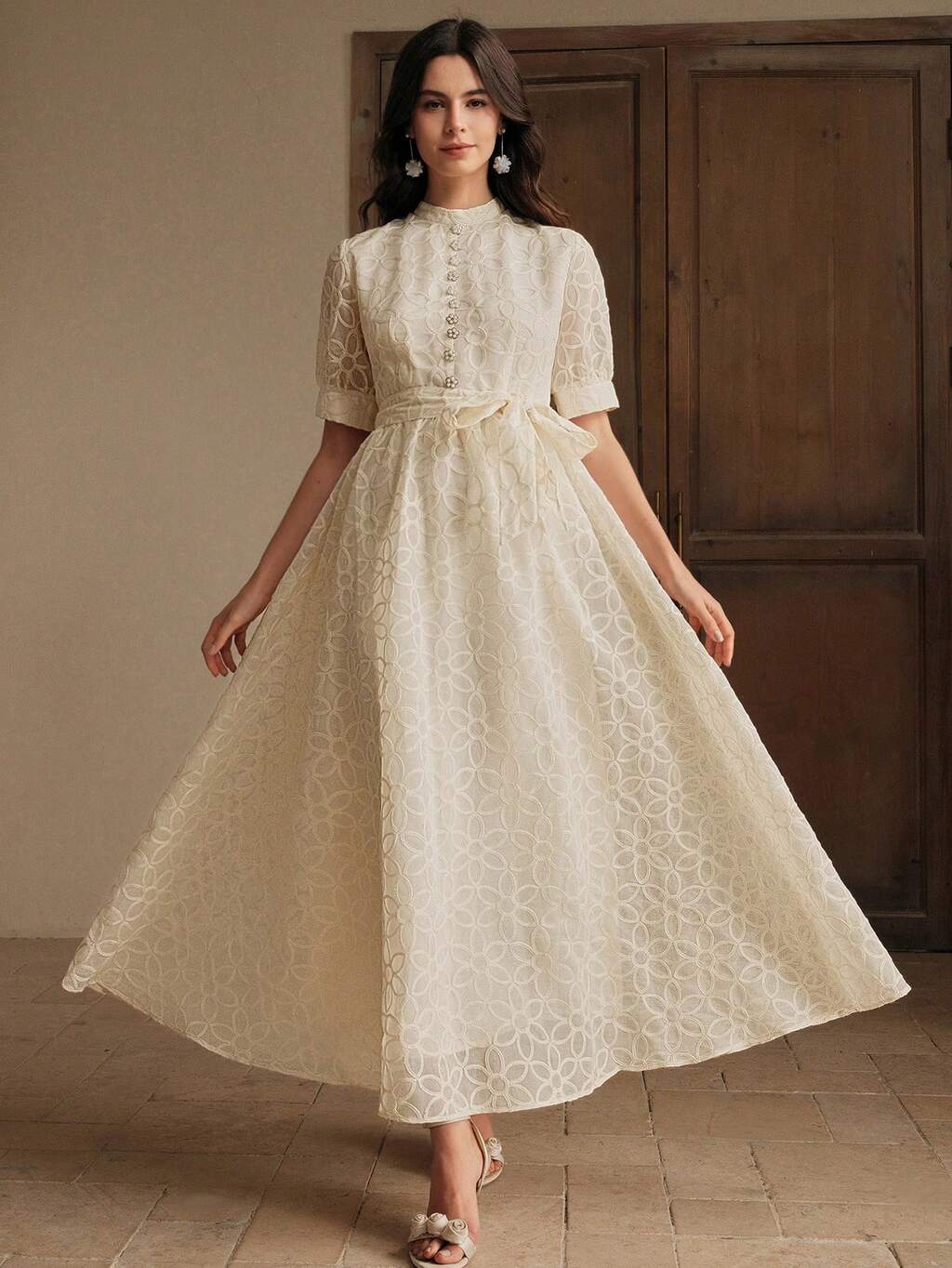 Vestido Cinturado de Mangas Bufantes Curtas de Renda Branca para Mulheres