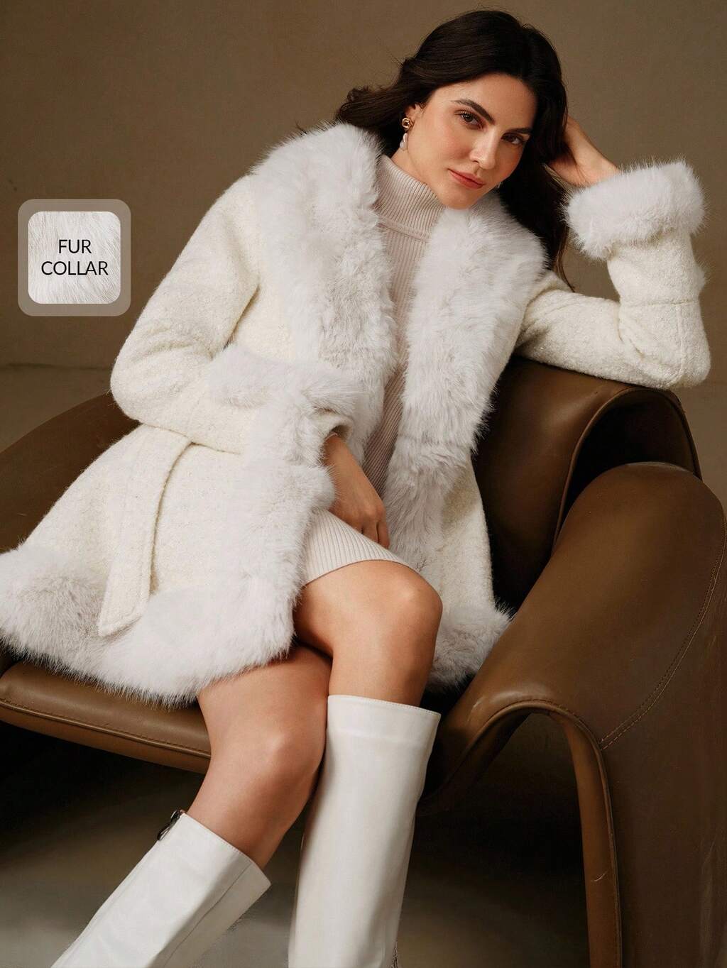 Jaqueta de Colarinho Felpudo com Cinto de Comprimento Médio, Adequada para Outono, Inverno, Saída, Elegante, Formal, Festa, Chique, Ano Novo, Casaco de Inverno Feminino, Natal, Trabalho, Formatura, Casamento, Luxo